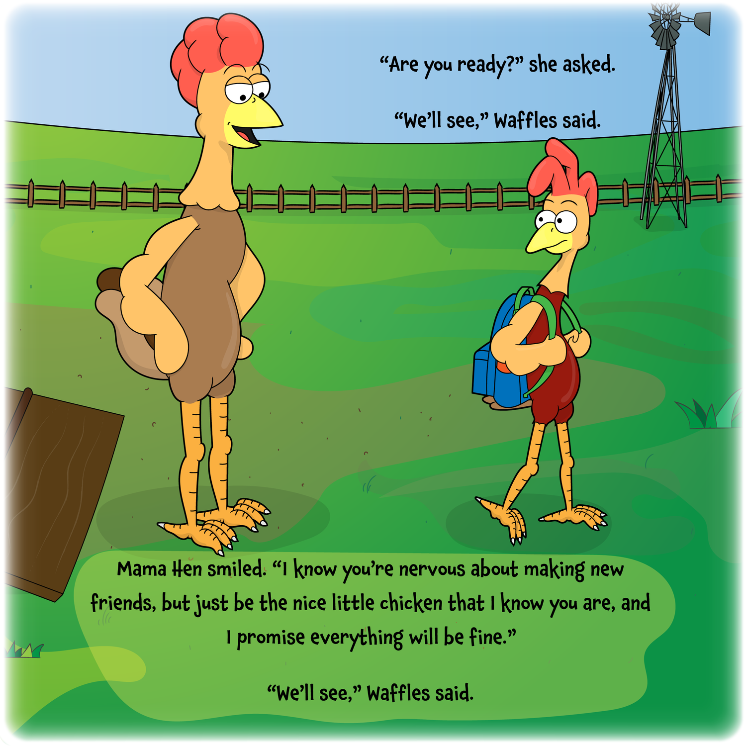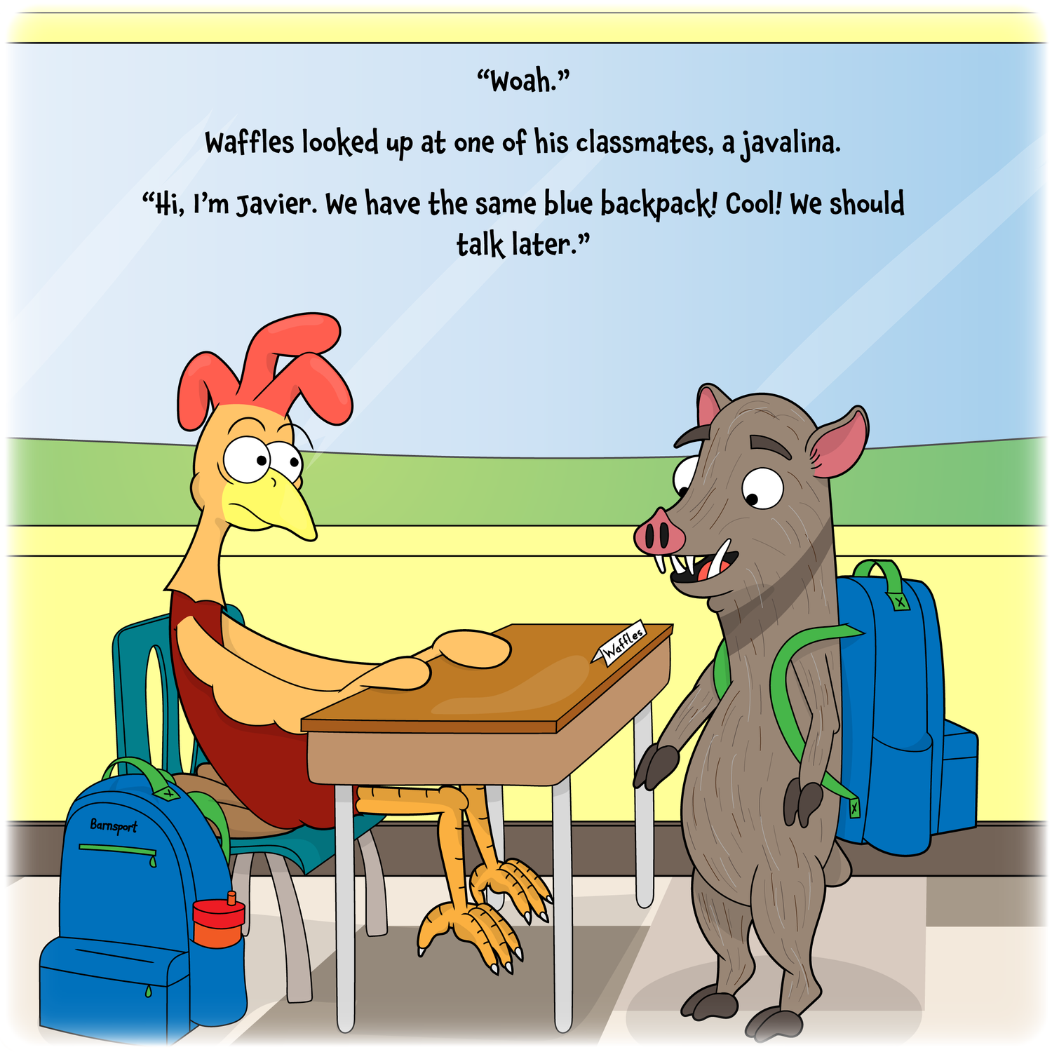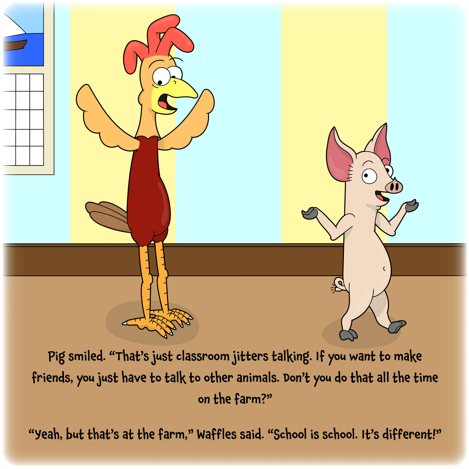 Waffles the Chicken loves meeting new friends at the farm, but school is school! It's different!